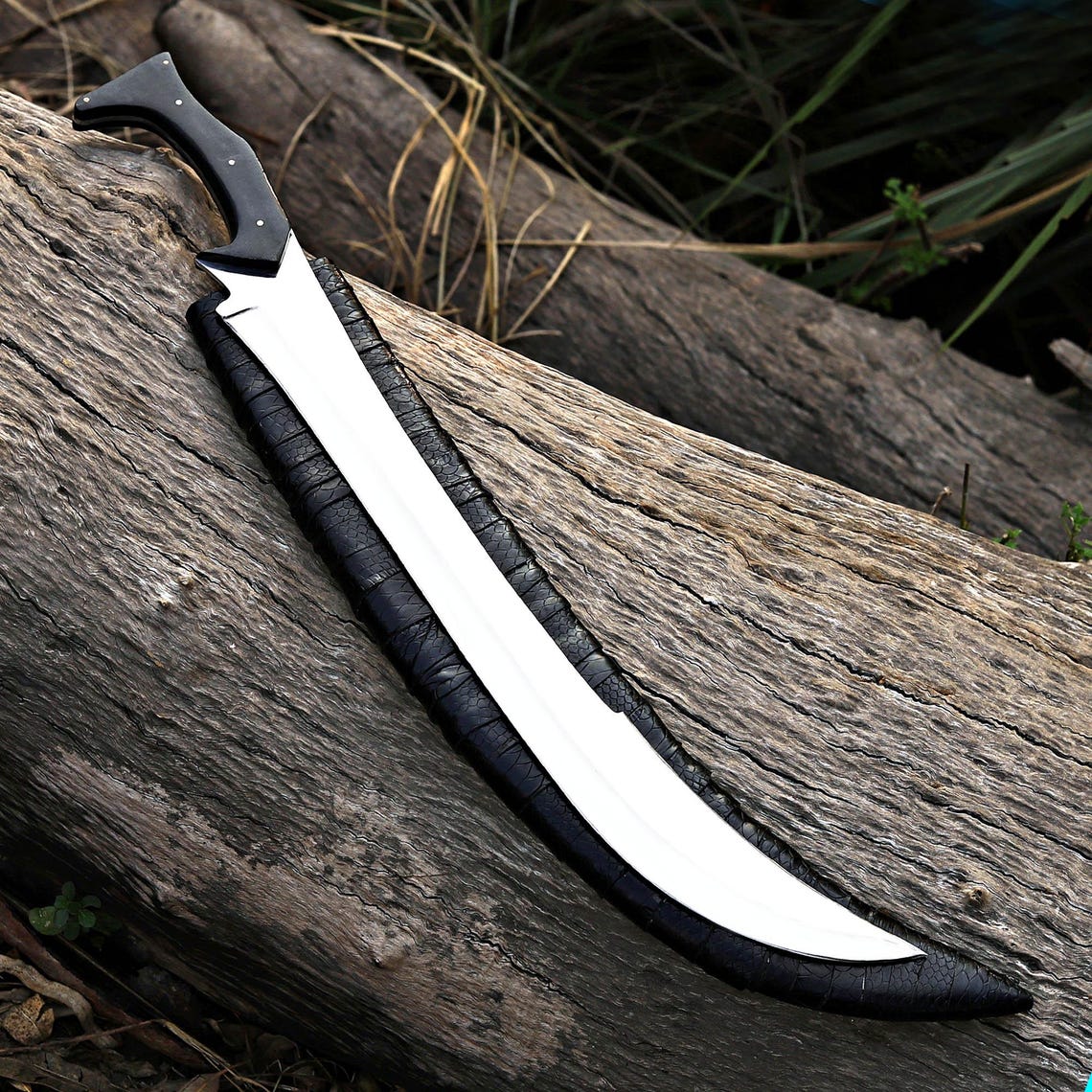 Elevate your outdoor adventures with this exquisite handmade sword. Crafted with precision using D2 steel, this blade offers unparalleled sharpness and durability. The ergonomic Black Wood handle ensures a comfortable, slip-resistant grip in any condition. Complete with a premium leather wrapped wooden scabbard cover for safe storage and transport.
