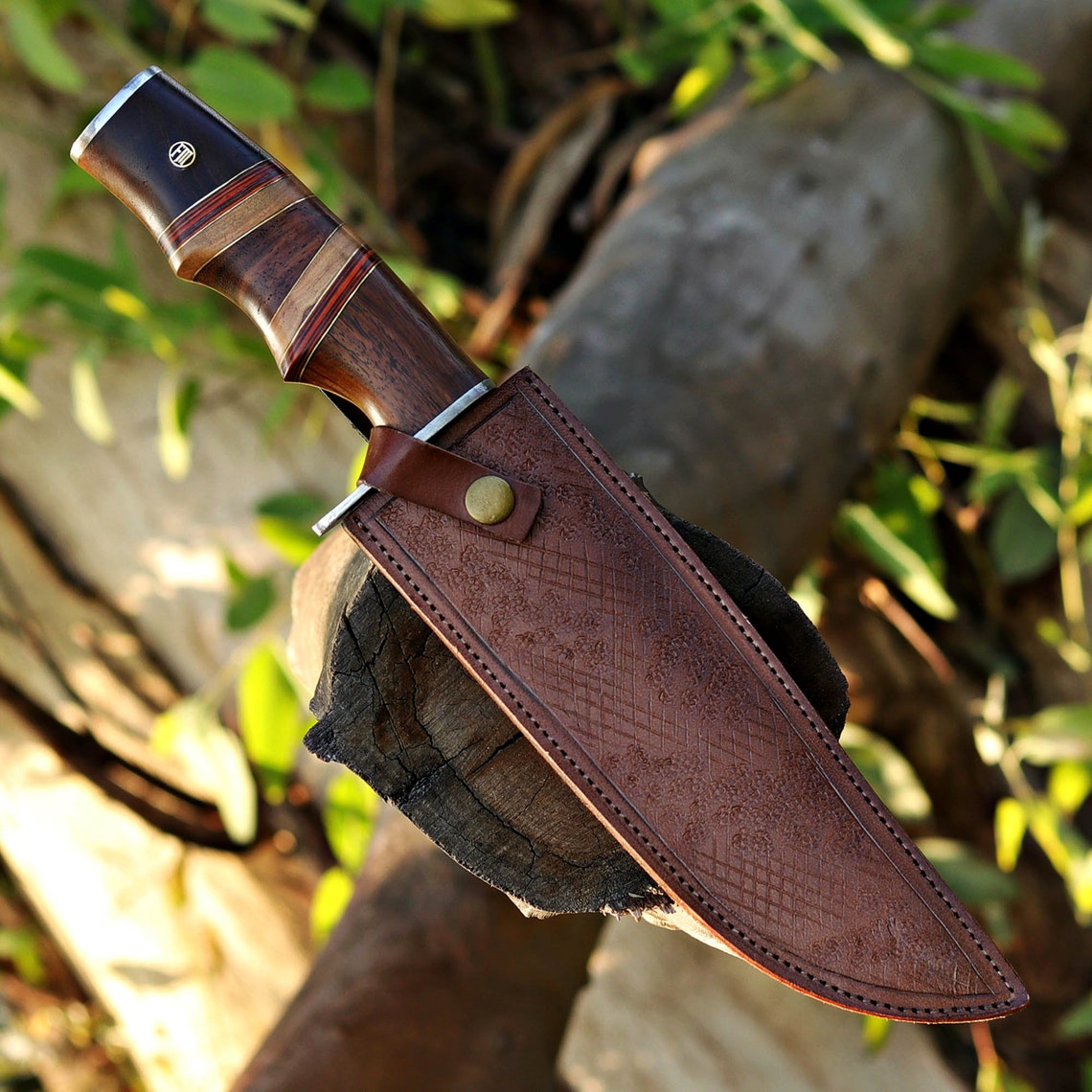 The Damascus Hunting Knife 2 features a blade made from premium Damascus steel, known for its distinctive patterns and exceptional strength. This steel offers excellent edge retention and is less prone to chipping. The handle, crafted from fine wood with brass spacers, provides a comfortable and aesthetically pleasing grip. Together, these materials ensure that the knife is both beautiful and functional, ideal for demanding outdoor tasks.