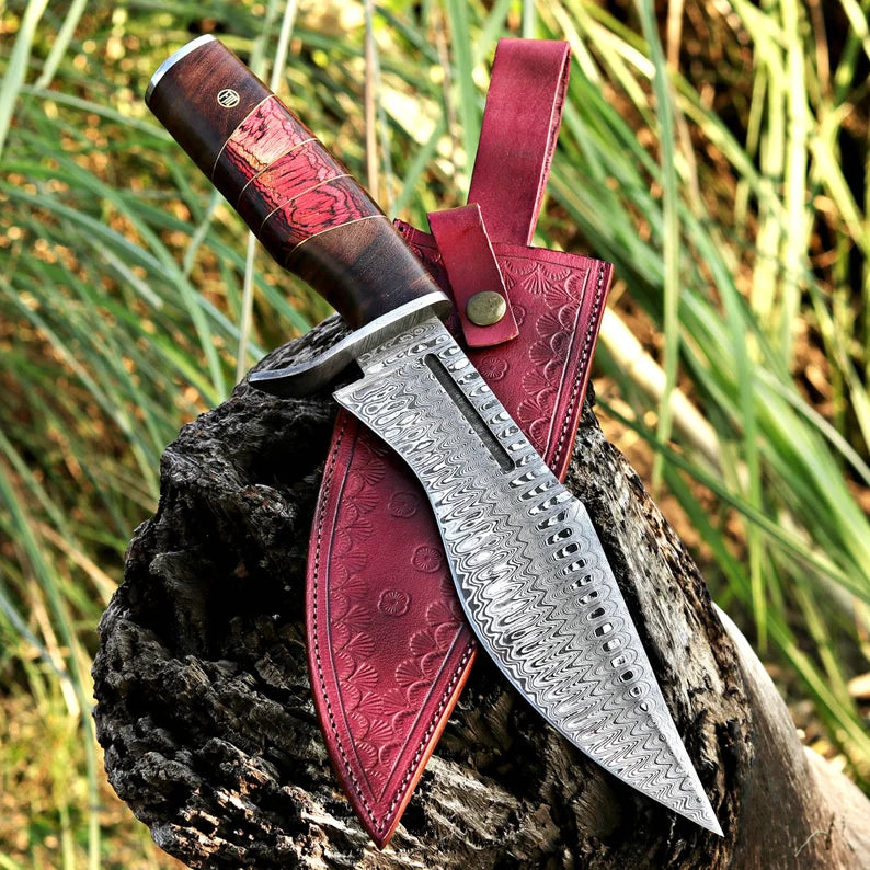 The Damascus Hunting Knife features a blade made from premium Damascus steel, known for its distinctive patterns and exceptional strength. This steel offers excellent edge retention and is less prone to chipping. The handle, crafted from fine wood with brass spacers, provides a comfortable and aesthetically pleasing grip. Together, these materials ensure that the knife is both beautiful and functional, ideal for demanding outdoor tasks.
