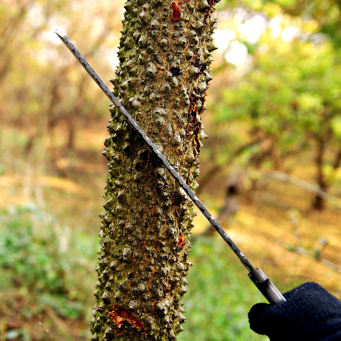 A machete is a powerful tool for clearing brush. In the tropics, machetes are ubiquitous, all-purpose tools: they have been used to carve trails through tropical forests, to slash out clearings for crops, to crack open coconuts and slice papayas. As a lightweight and versatile tool, it is ideal to clear dead plants at the end of harvest, remove weeds, cut down small trees, and chop down vines from trees.