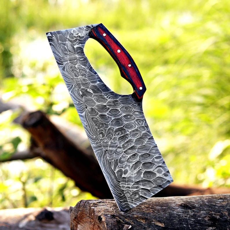 Enhance your culinary and outdoor experiences with this Hand-Forged Cleaver Knife, expertly crafted with Damascus Steel for exceptional sharpness and durability. This cleaver's stunning blade, with its unique pattern and edge retention, promises to handle all your chopping, slicing, and splitting tasks effortlessly. Paired with an ergonomic Pakka Wood Handle and secure steel pins, this knife ensures a non-slip grip, even in challenging conditions.