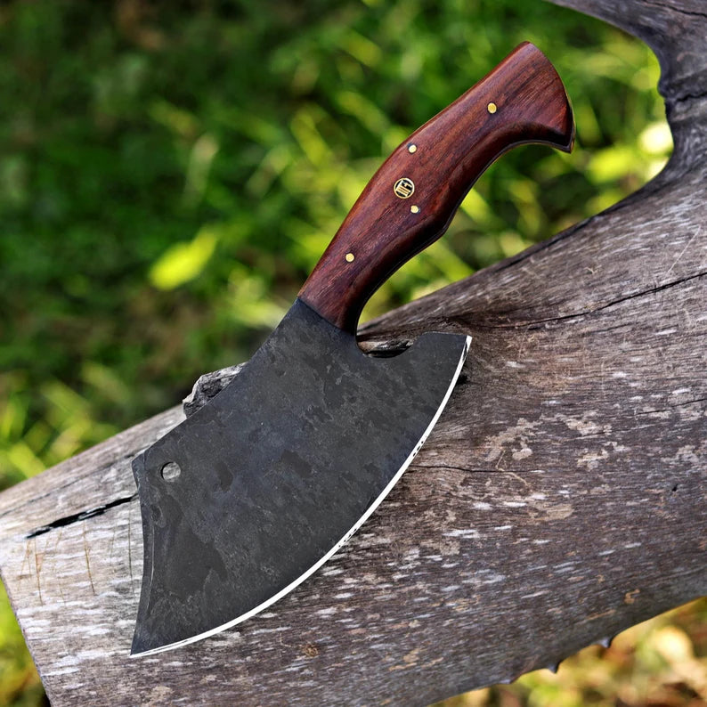 Upgrade your kitchen and outdoor toolkit with this Hand-Forged Cleaver Knife, a perfect blend of artistry and functionality. This cleaver is meticulously hand-crafted using high-polished J2 Steel, renowned for its exceptional sharpness and durability. The wide, razor-sharp 7.3-inch blade ensures efficient cutting, chopping, and slicing, whether you're preparing large cuts of meat or tackling tough bones. The ergonomic wood handle, secured with brass pins, provides a secure, slip-resistant grip, making it ideal for both professional chefs and outdoor enthusiasts.