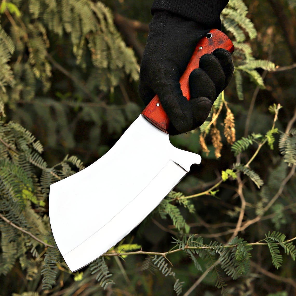Elevate your outdoor adventures with this exquisite handmade Cleaver. Crafted with precision using high-polished steel, this blade offers unparalleled sharpness and durability. The ergonomic wood handle ensures a comfortable, slip-resistant grip in any condition. Complete with a premium leather cover for safe storage and transport.