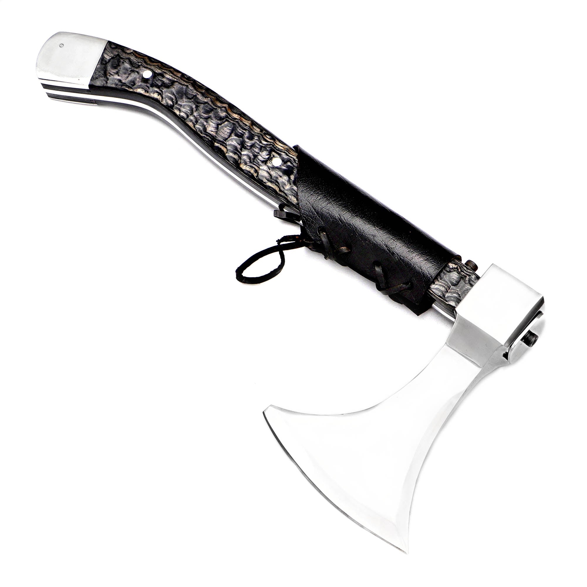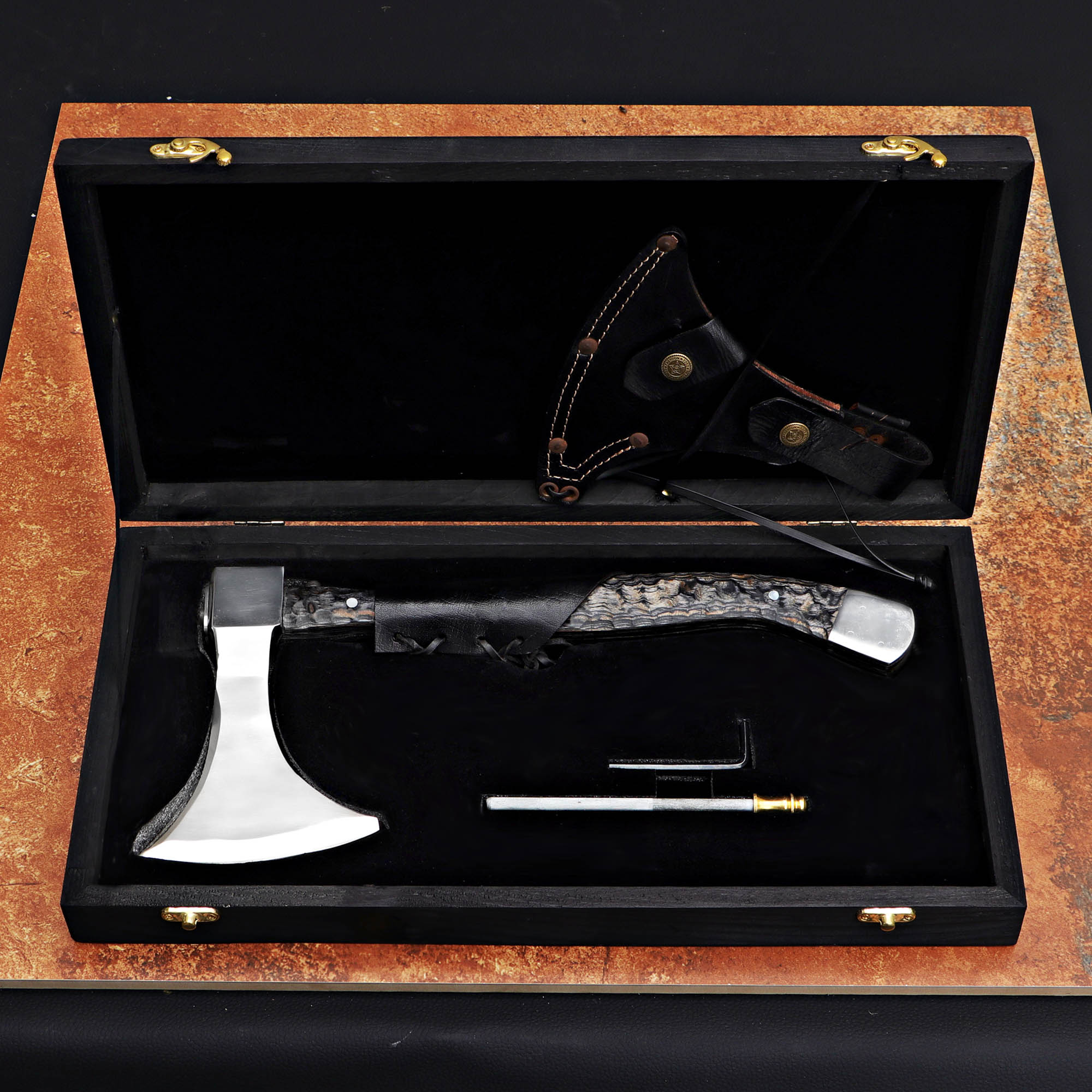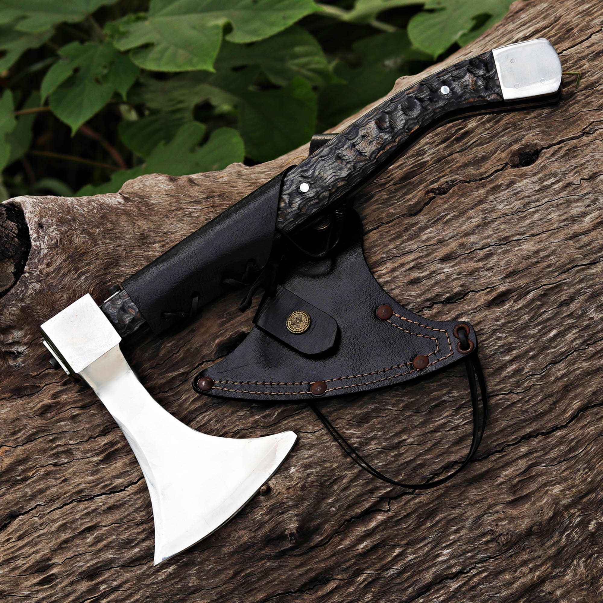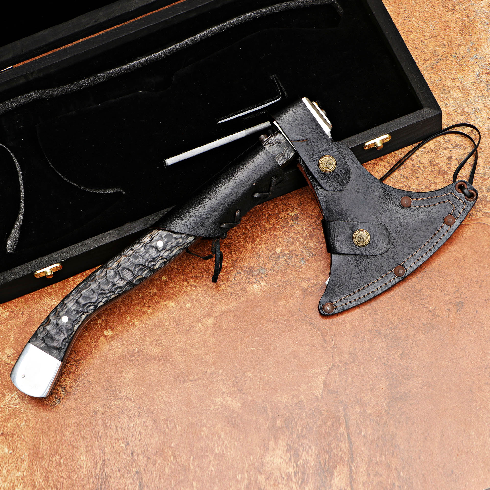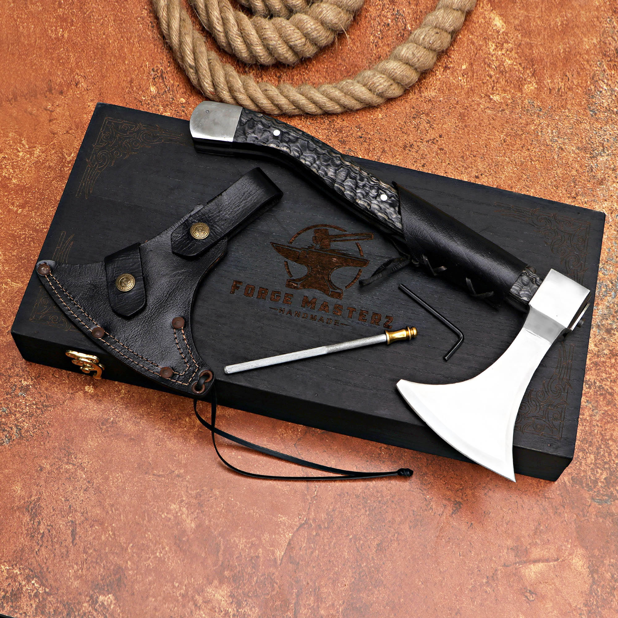 Experience the power of craftsmanship with our Black Handle Handmade Axe. This durable axe features a high-quality steel blade and a sleek black handle, complemented by a wooden box for easy storage. Perfect for camping, chopping wood, or as a display piece.
