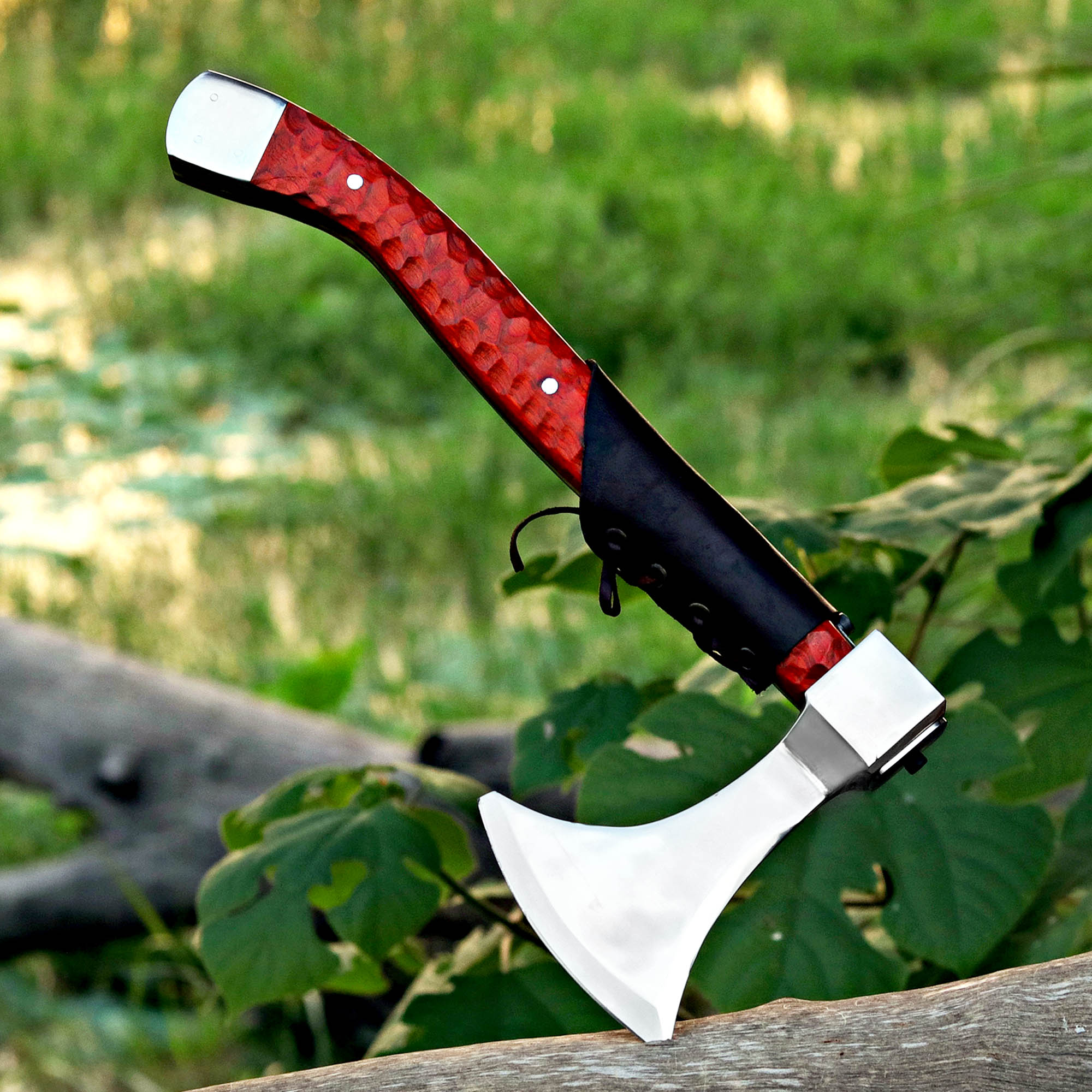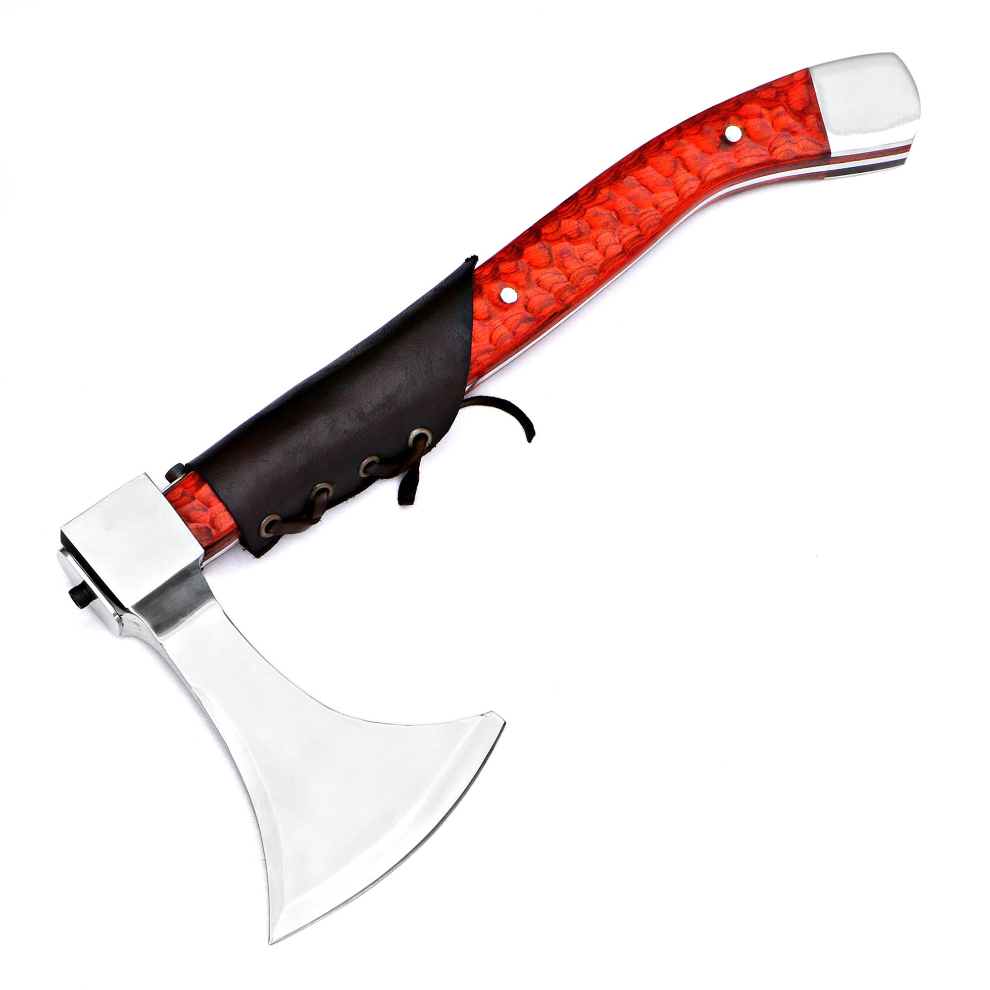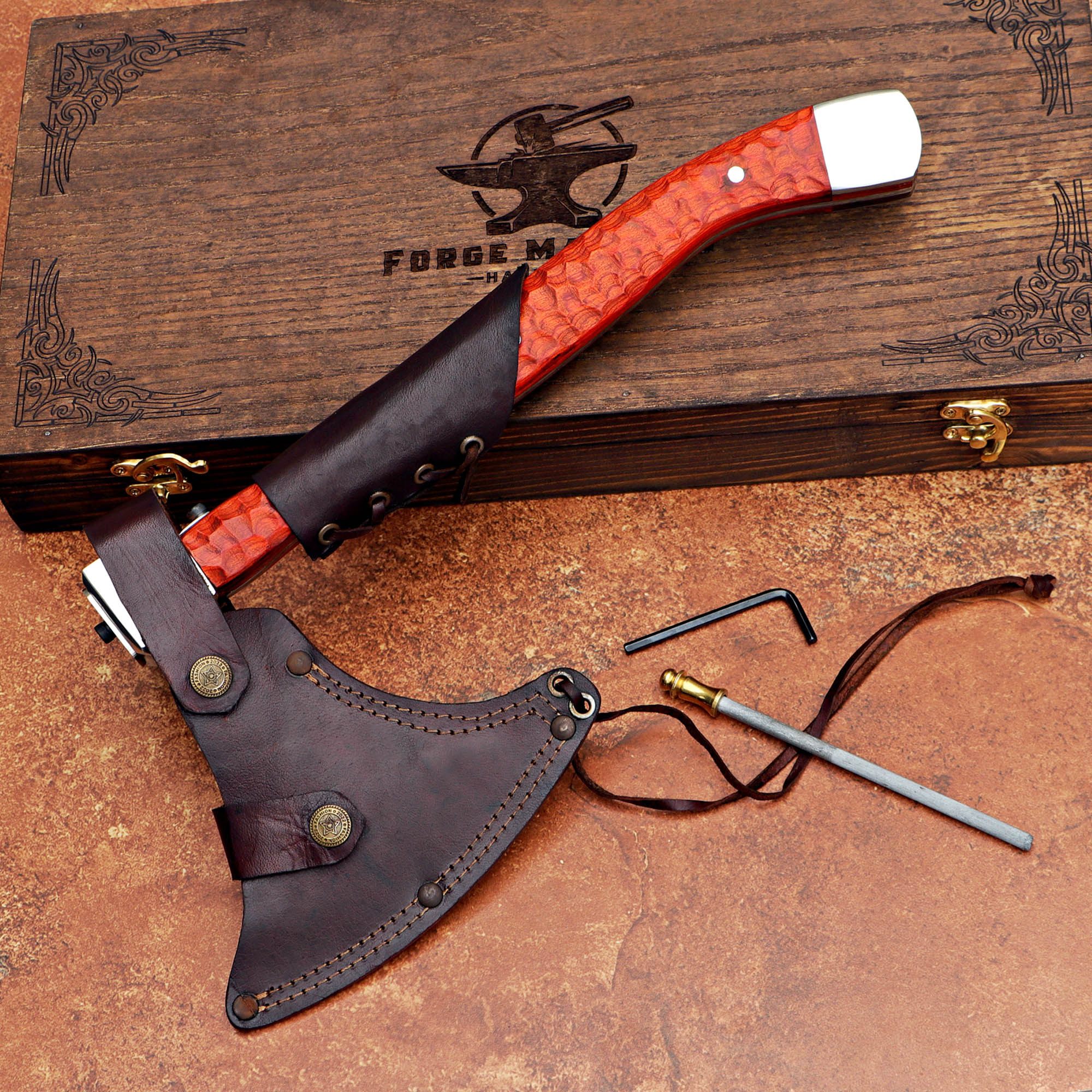 A versatile red handle axe, lightweight with 13 chrome steel. Perfect for chopping wood, throwing, and more. Includes a wooden box and accessories.