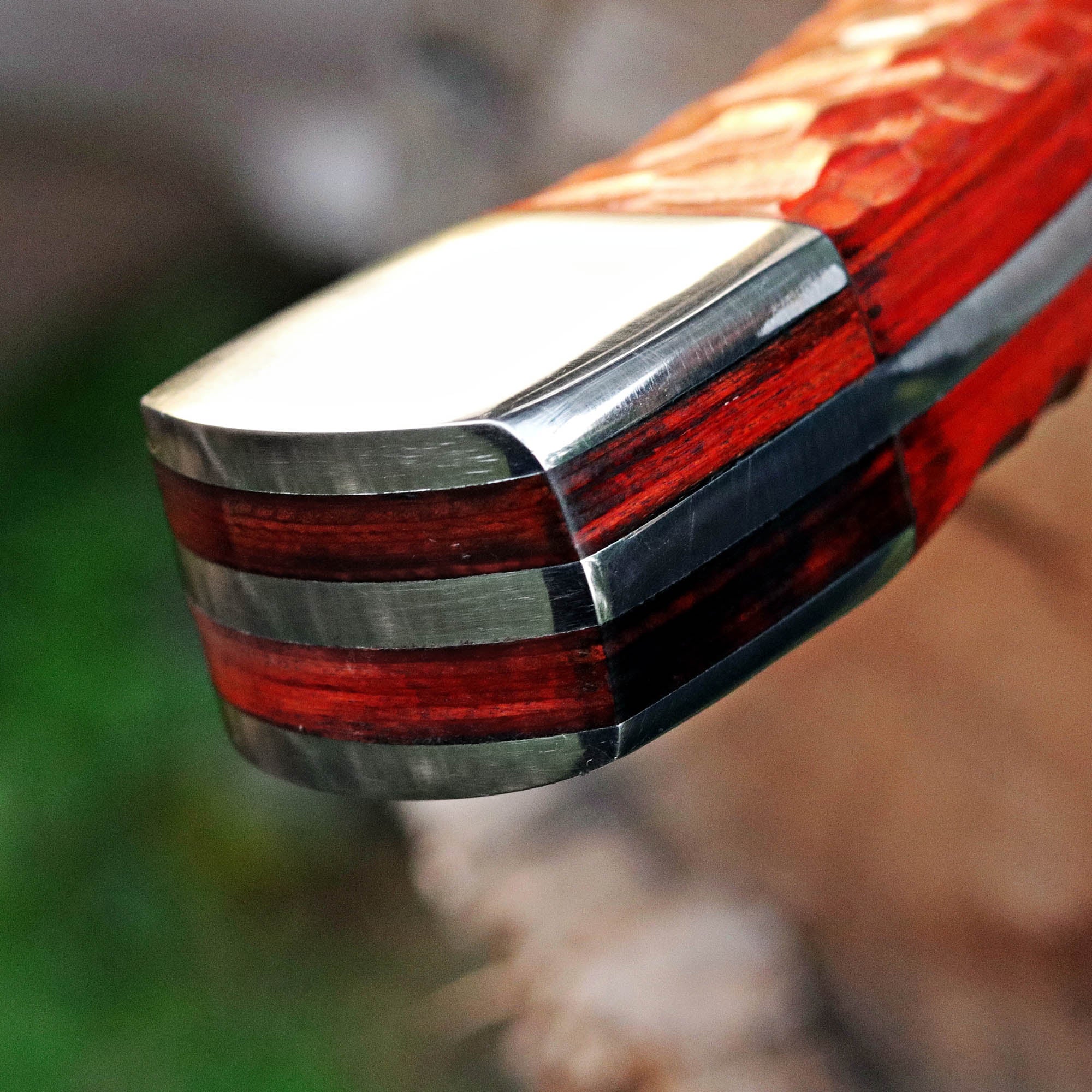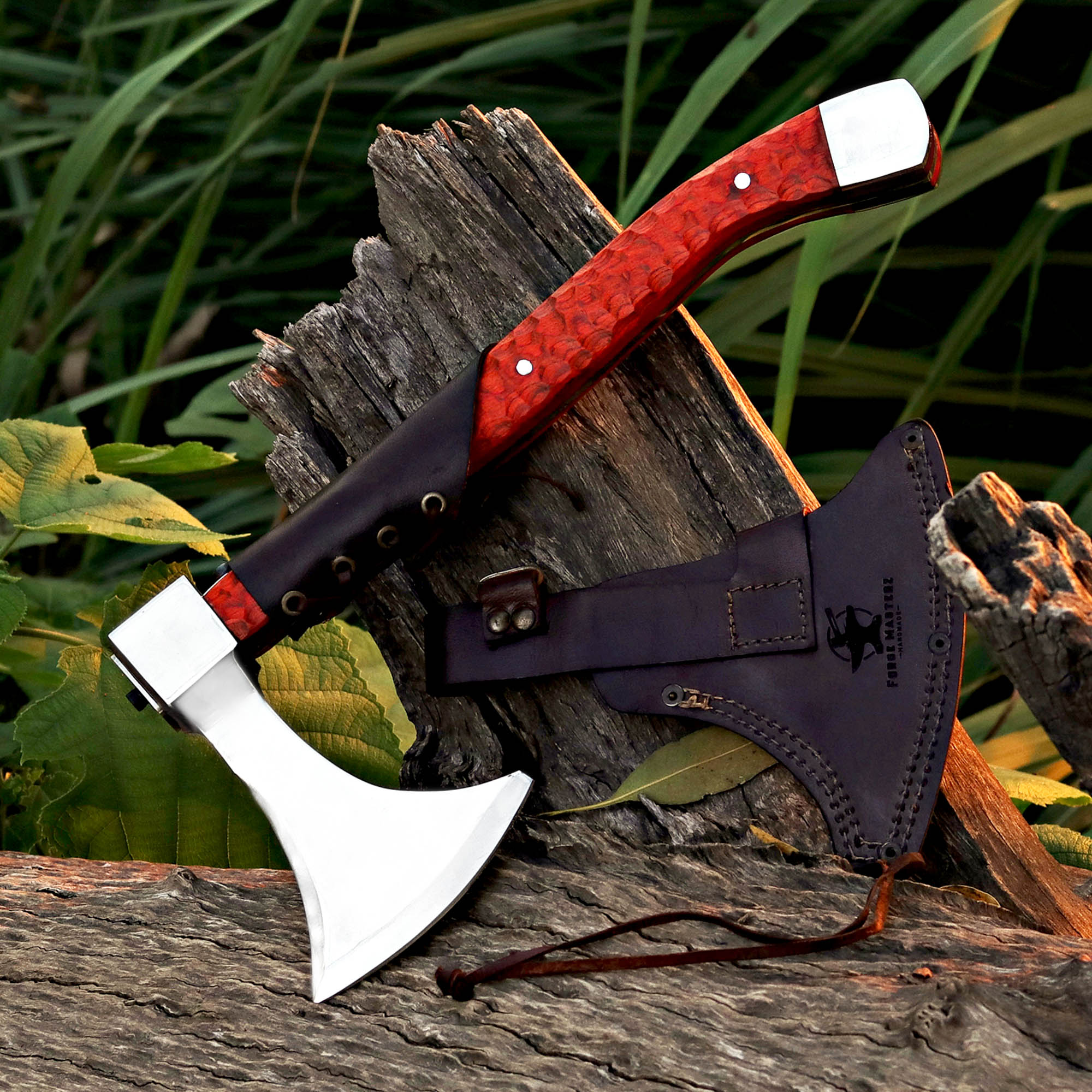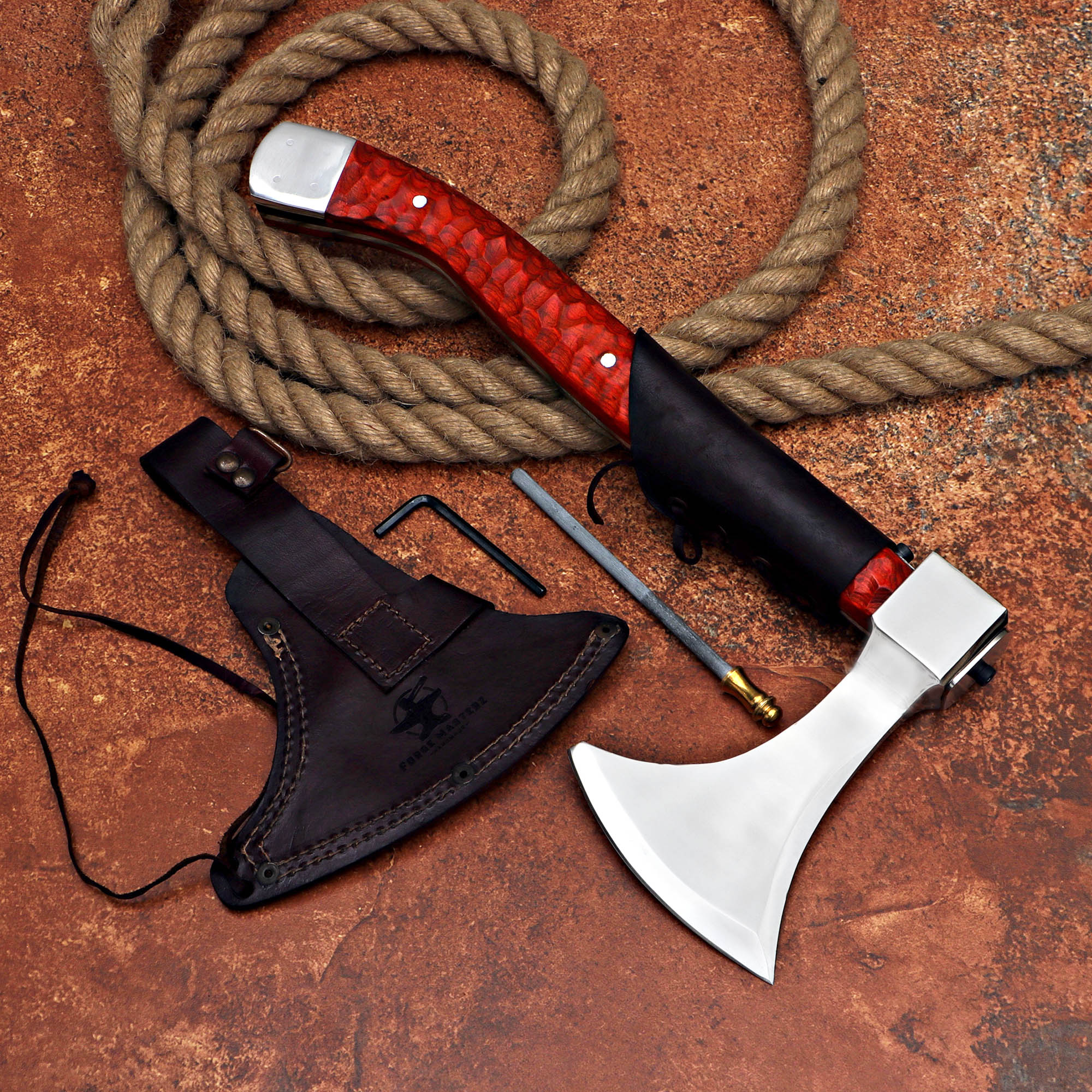 A versatile red handle axe, lightweight with 13 chrome steel. Perfect for chopping wood, throwing, and more. Includes a wooden box and accessories.