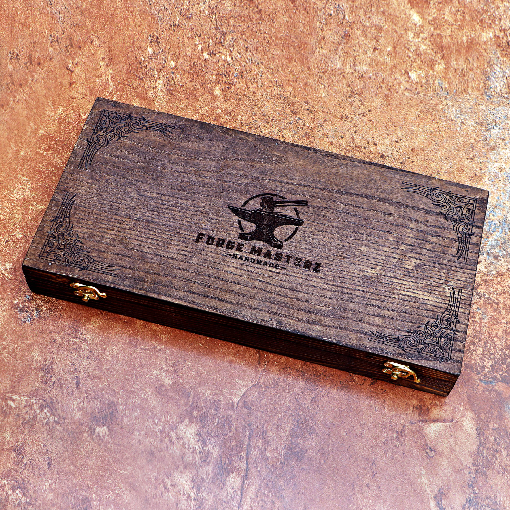 This axe comes in a wooden box along with a blade sharpener, L-Key and Leather Sheath too