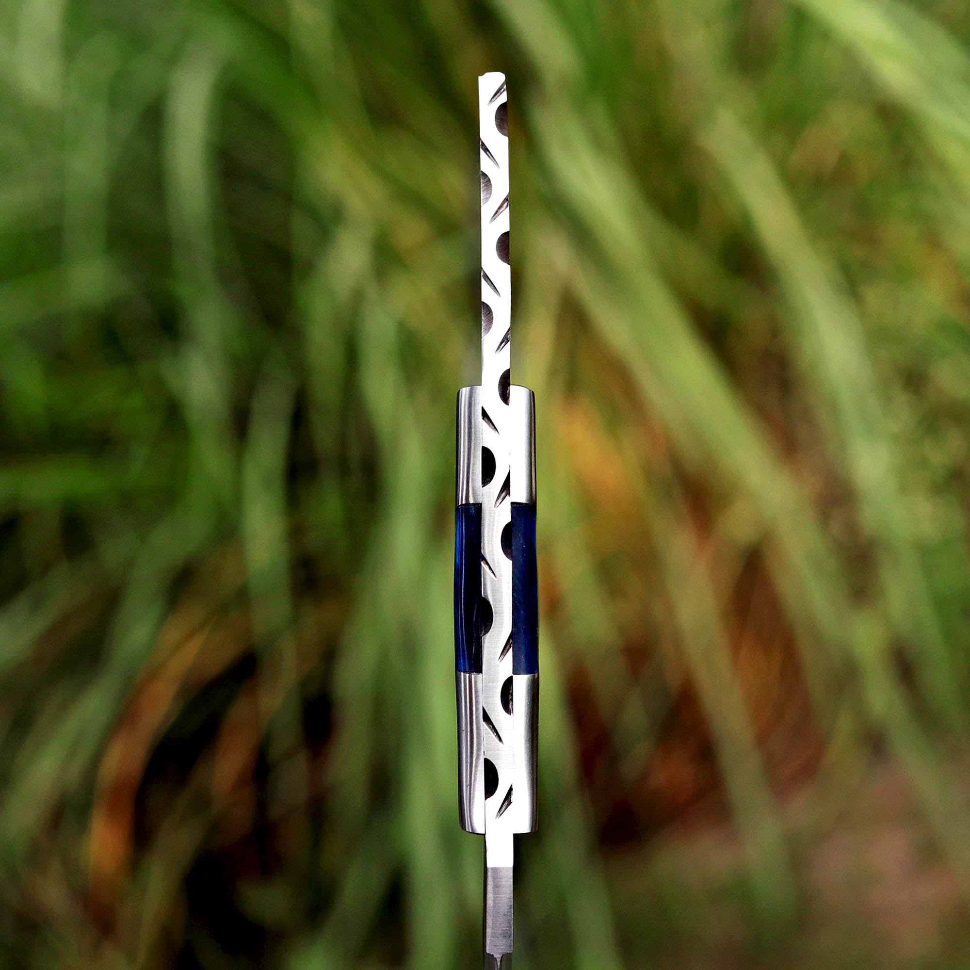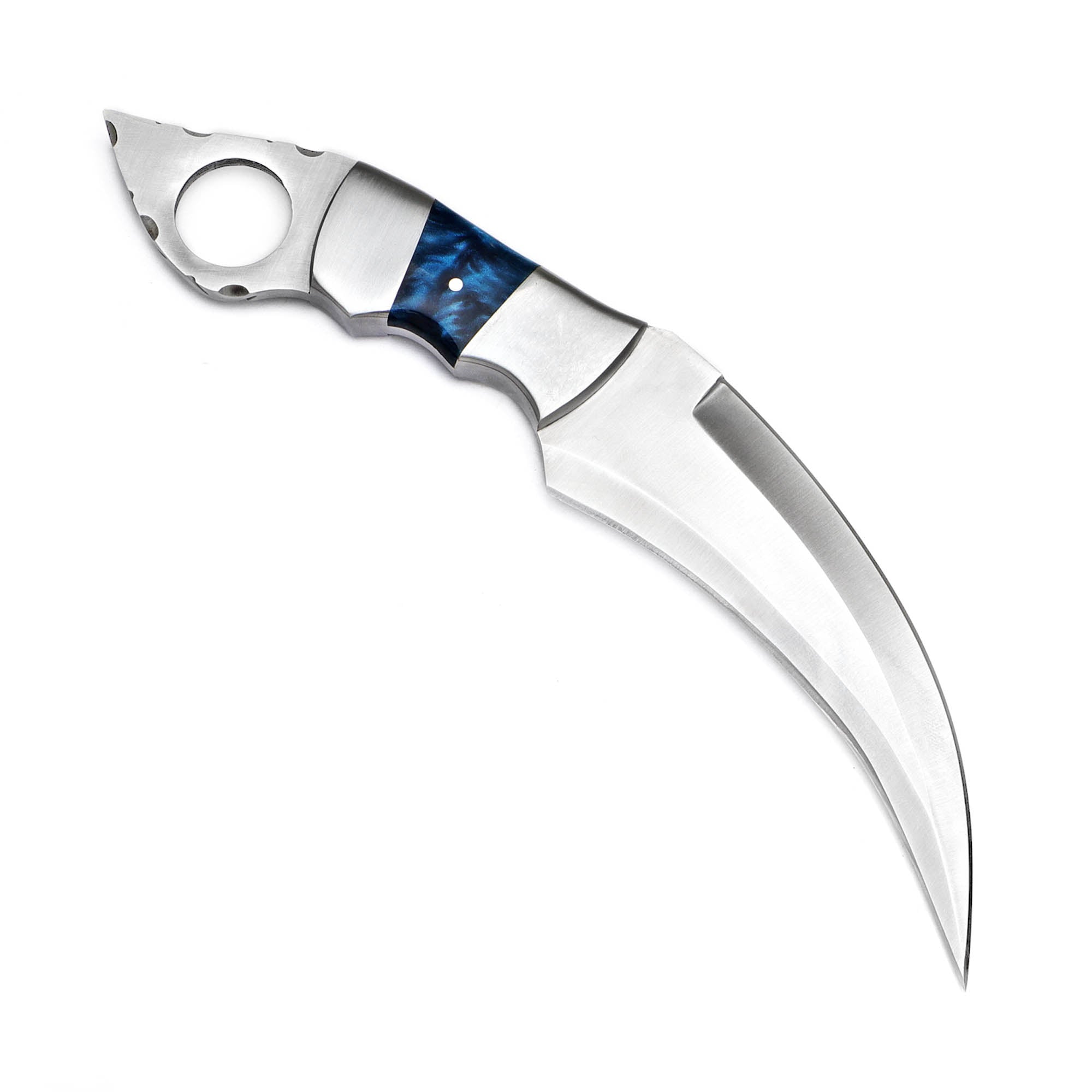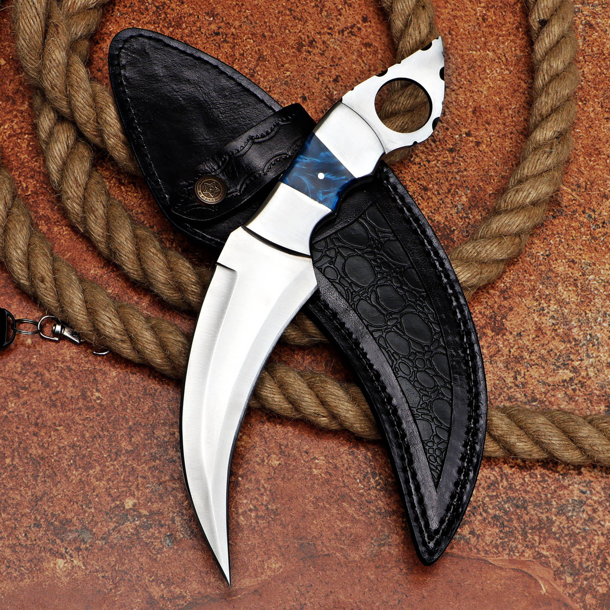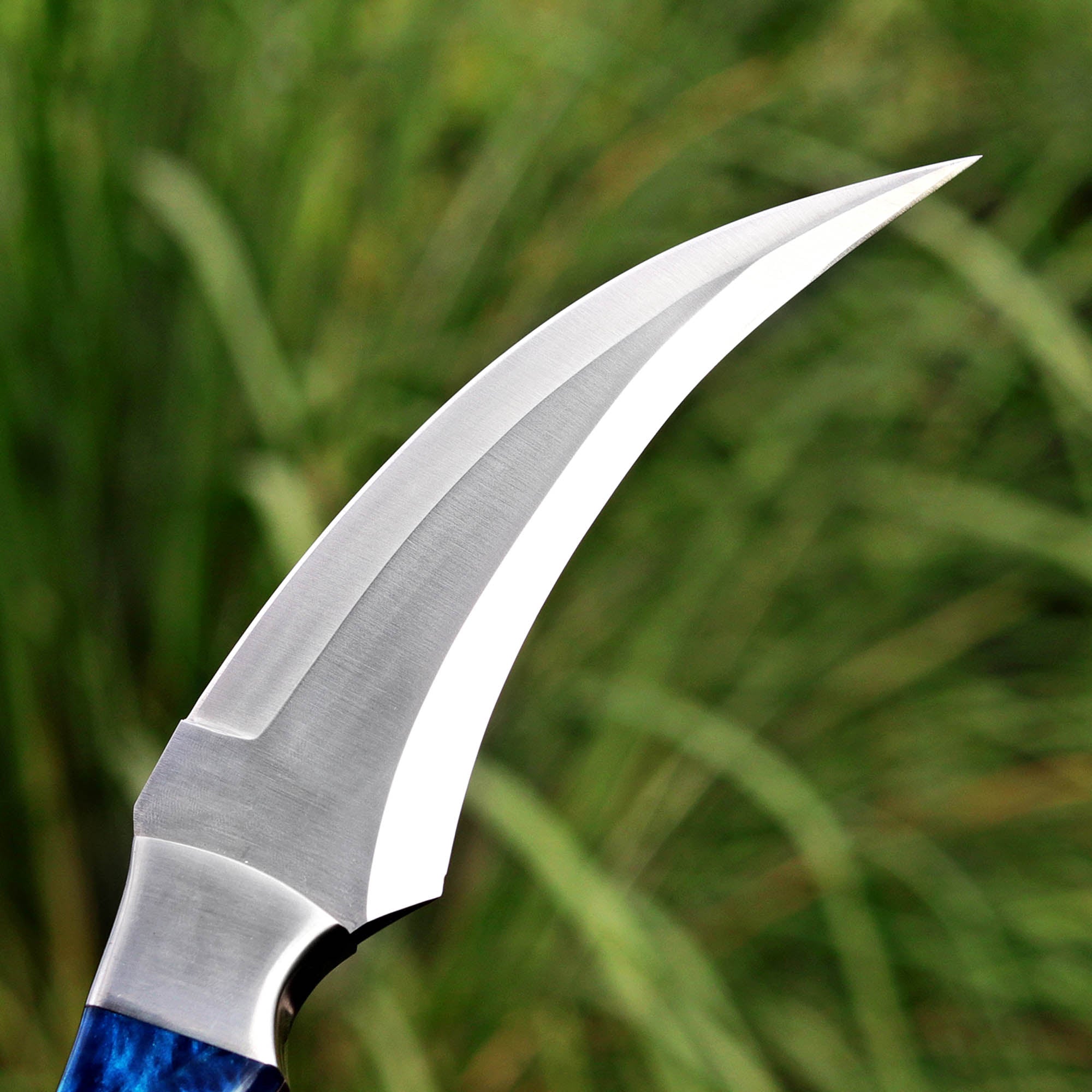 Blue resin handle Karambit with a D2 steel blade and leather sheath. Ideal for collectors and enthusiasts.