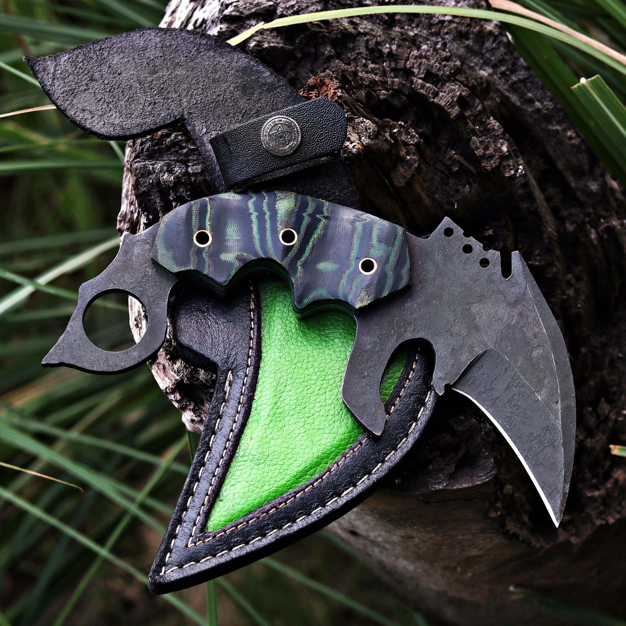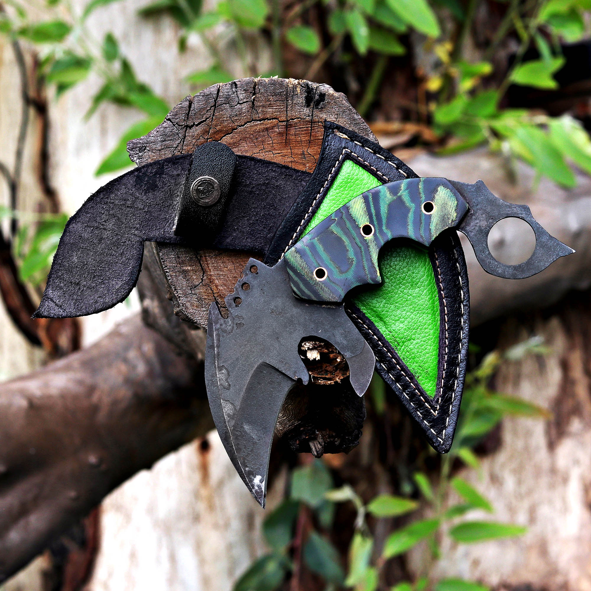 Camouflage pattern handle Karambit with a 420J2 steel blade. Perfect for tactical and outdoor use. Includes a leather sheath.