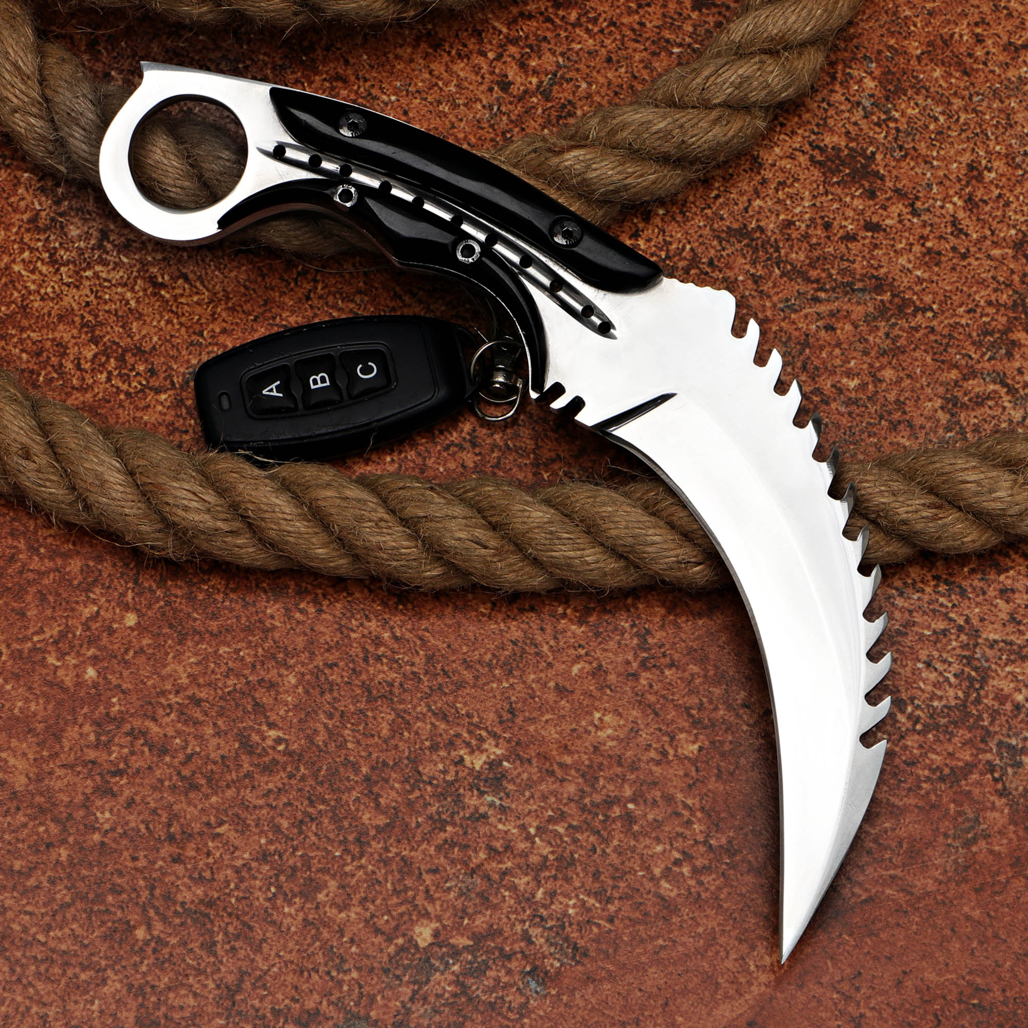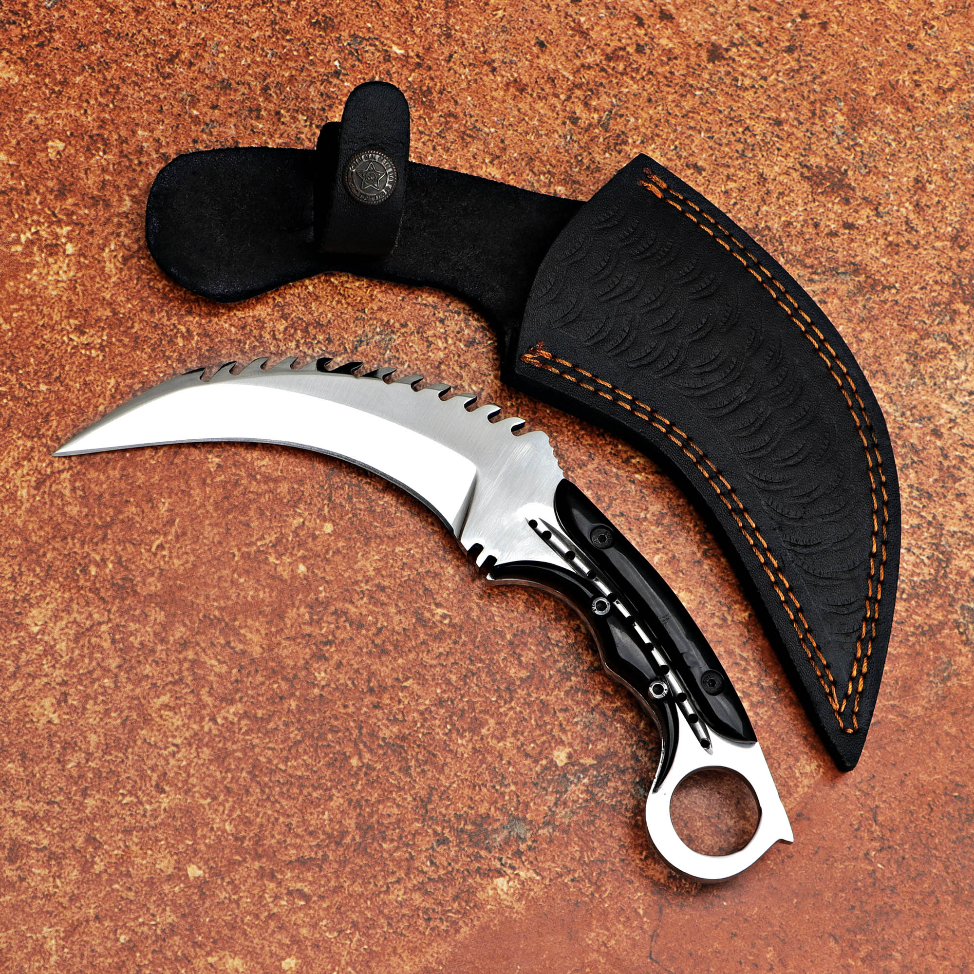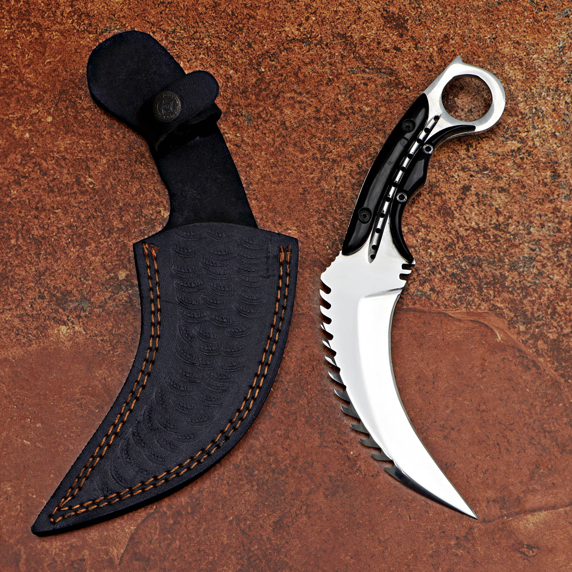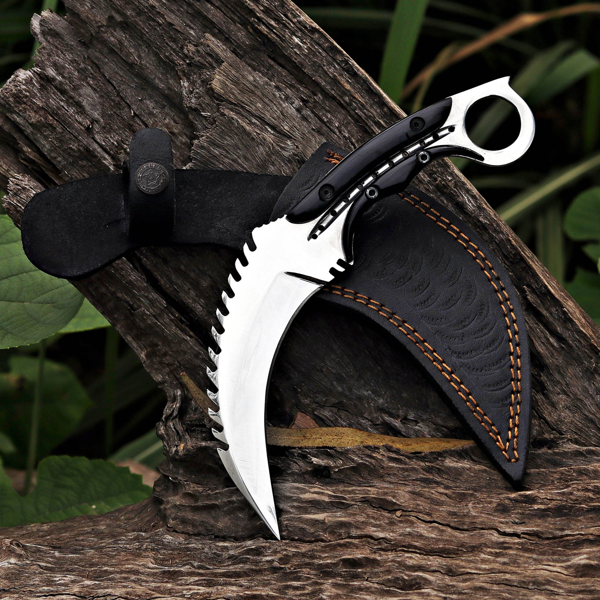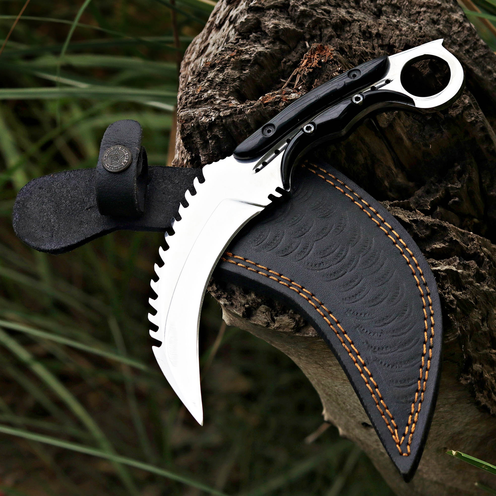 Black resin handle Karambit knife with a D2 steel blade. Perfect for tactical use. Includes a leather sheath.