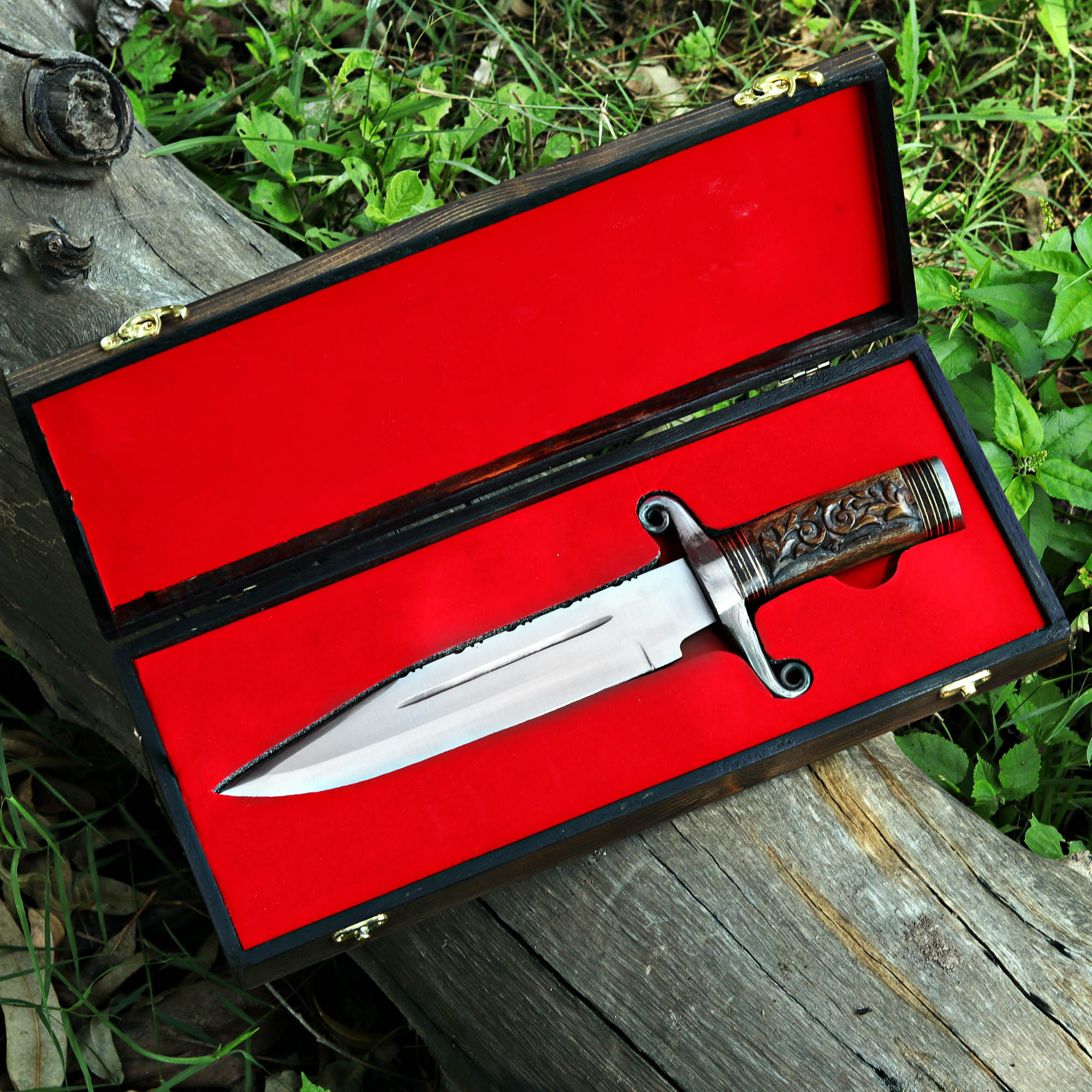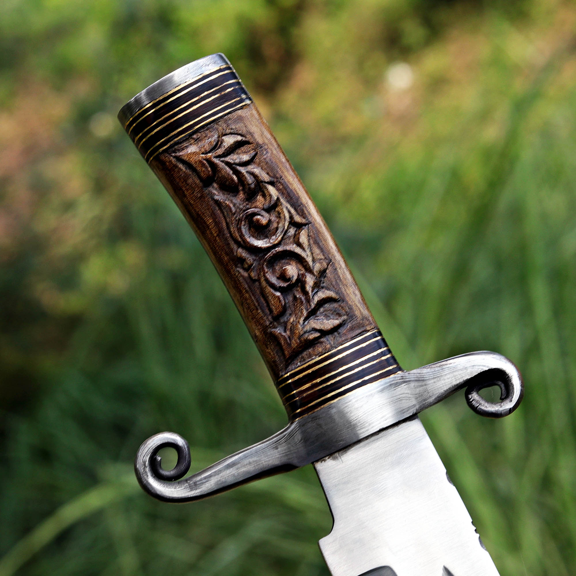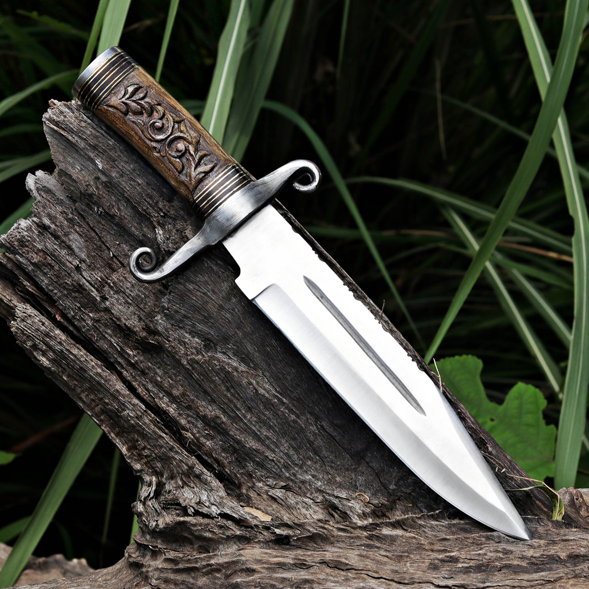 Our hunting knife features a robust high-carbon steel blade known for its exceptional sharpness and durability. The engraved handle provides a comfortable grip, ensuring safety and precision during use.