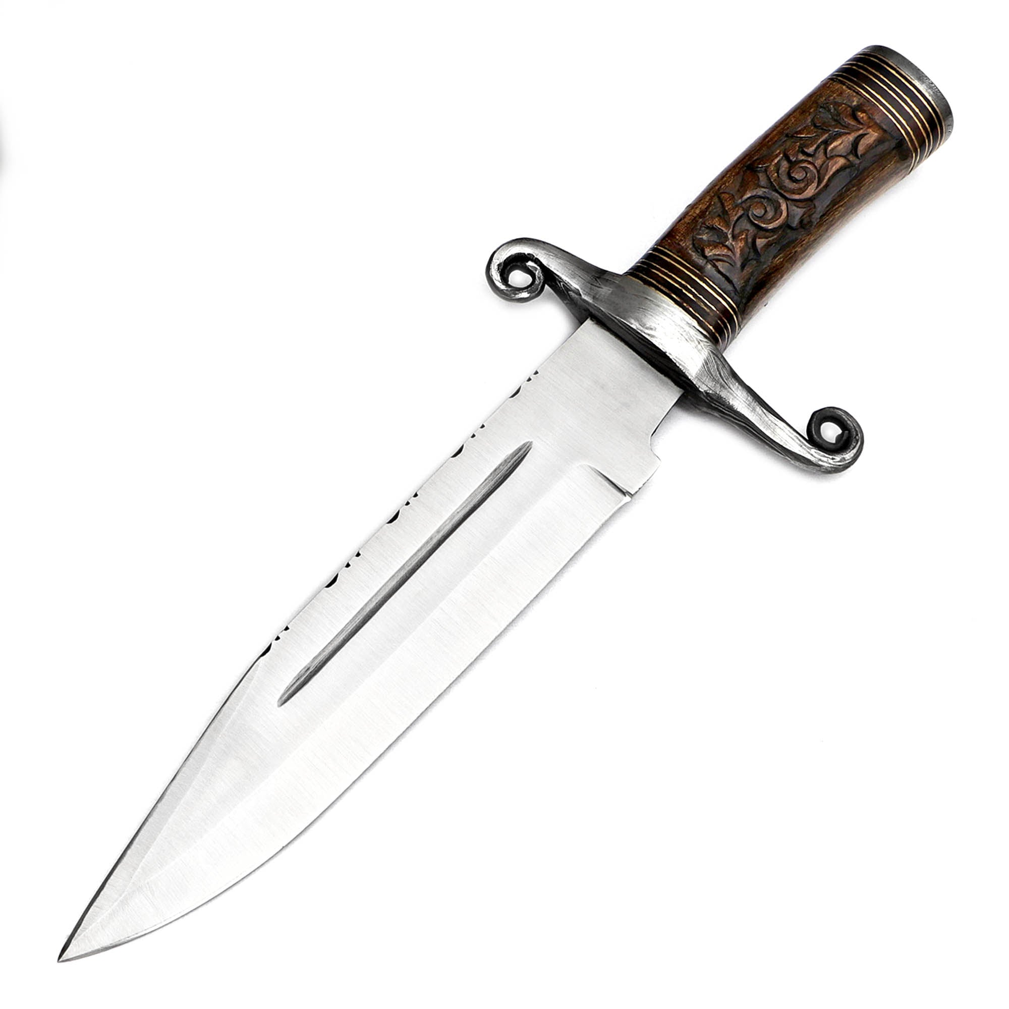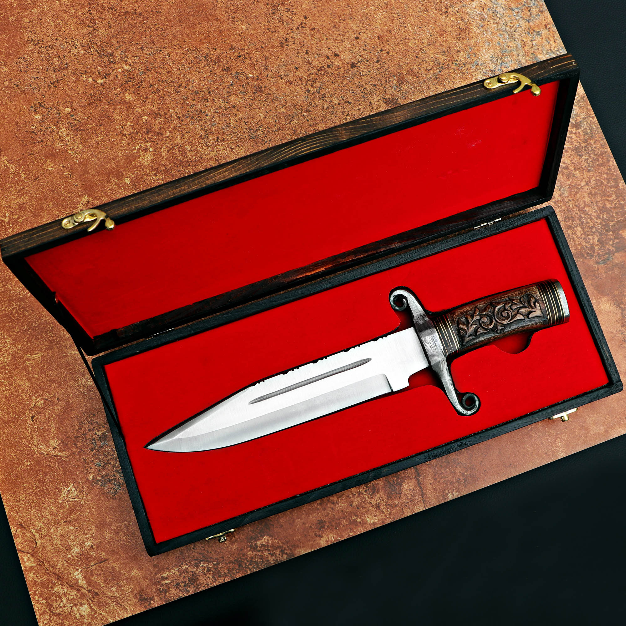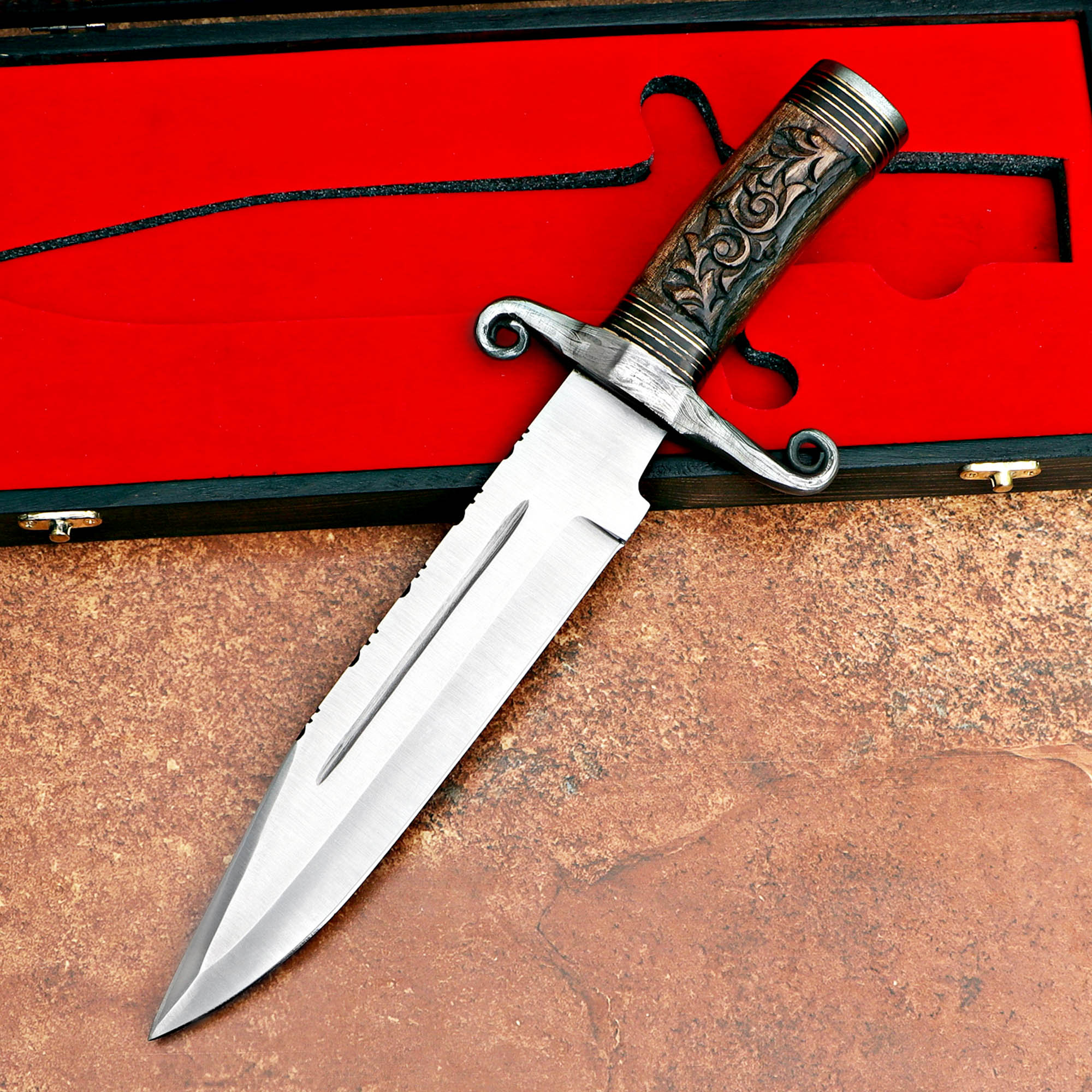 Our hunting knife features a robust high-carbon steel blade known for its exceptional sharpness and durability. The engraved handle provides a comfortable grip, ensuring safety and precision during use.
