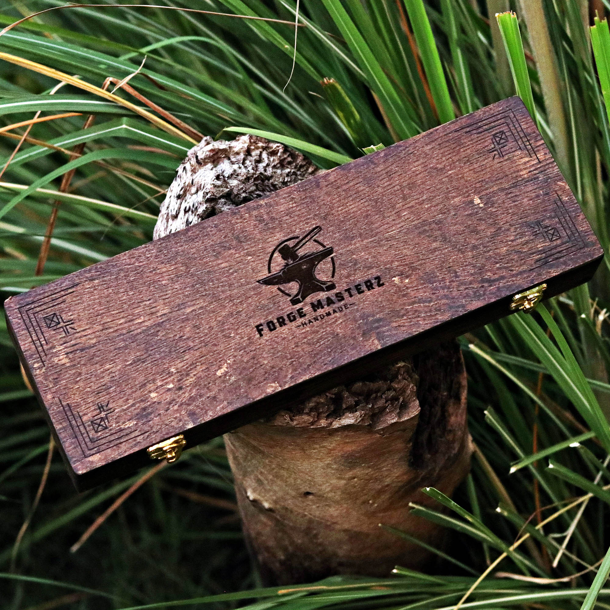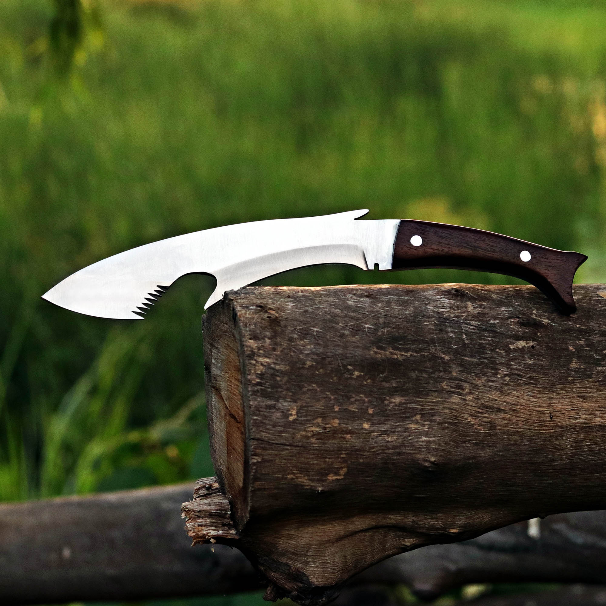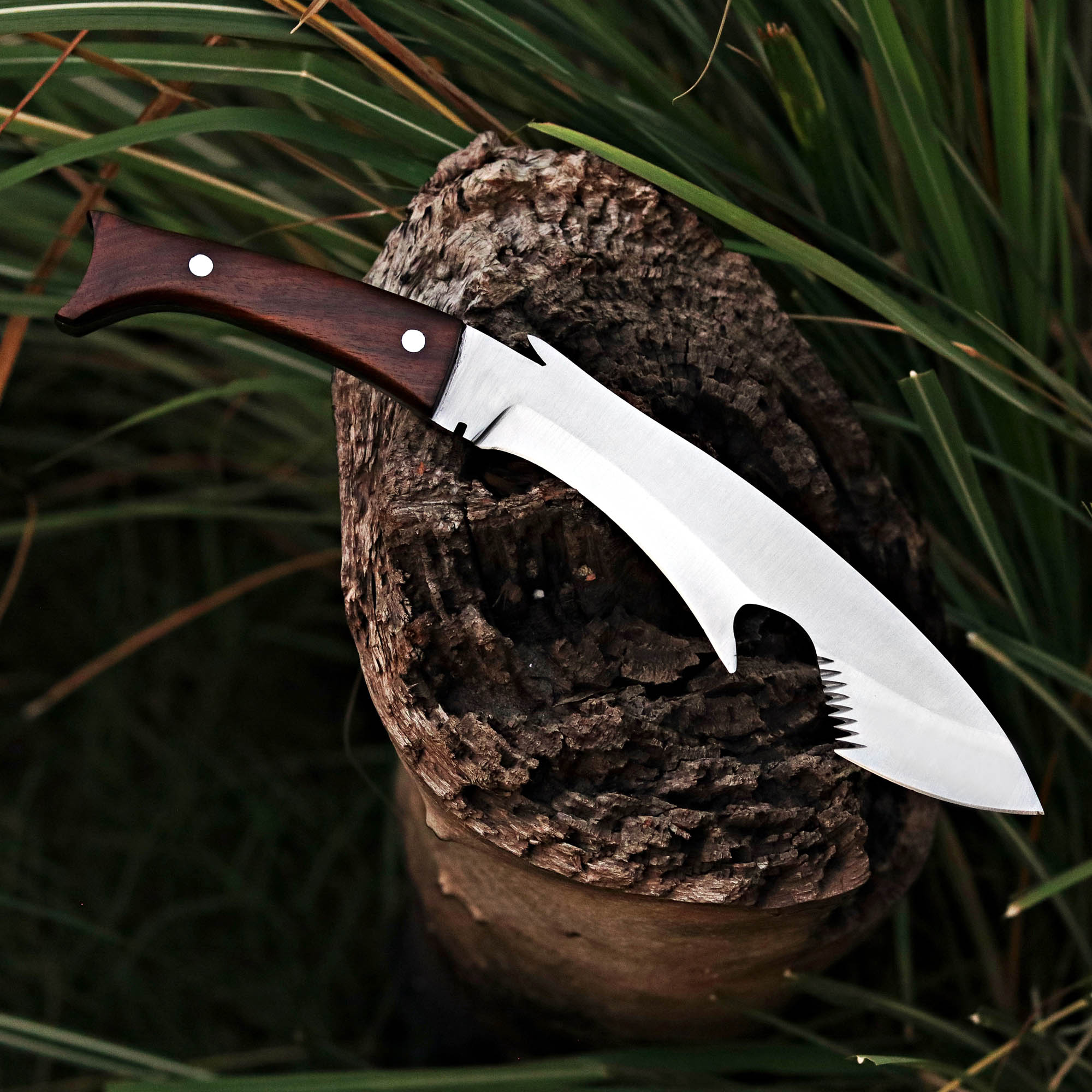 A sharp and striking Shark Face knife made of J2 steel, with a rosewood handle and leather cover.